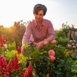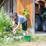 Bis der Älteste den Hof übernimmt wird wohl auch das direkt vor dem neuen Laufstall angelegte Beet üppig bewachsen sein. Rote Nelken, grün-gelber Frauenmantel und eine dunkelgrüne Zierkiefer hat die gelernte Floristin schon eingepflanzt. „Da blüht jetzt nicht so viel, aber es ist doch einfach schön, wenn überall ein bisschen was ist“, sagt Renate Mix lächelnd. Die Auswahl der Pflanzen hat sie mit Bedacht getroffen: Die widerstandsfähigen, mehrjährigen Nelken und der Frauenmantel werden den Boden um die kleine Kiefer schnell bedecken und alle drei der Sonne und dem Wind an der Ecke beim Laufstall trotzen. Unkraut hat dort schlechte Karten und Renate ein Beet weniger zum Ausgrasen. „Über frisches Gras freuen sich nur unsere Kühe“, lacht sie. Der Misthaufen gegenüber hingegen freut den Kürbis, der dort direkt auf dem natürlichen Nährboden wächst. Mit einer Schubkarre holt sie sich noch natürlichen Dünger für das Gemüse-Hochbeet. Auf dem Weg zurück vom Laufstall zum Hochbeet bleibt Renate Mix nochmal am Beet vor der Terrasse stehen. Sie stützt die schweren weißen Blüten der Pfingstrose mit einem Staudenring vor dem nächsten Regenschauer. Die Beete an der blumengeschmückten Hausseite entlang bestehen vorwiegend aus mehrjährigen Stauden. „Die kümmern sich fast um sich selbst und es blüht zu jeder Jahreszeit etwas“, sagt Renate Mix.