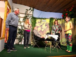 Szenenbild (v. l. n. r.) mit Familienvater Anderl (Eugen Unterstraßer), dessen Schwester Sandra (Melanie Poppe), Mutter Liselotte (Lisa Forstner) und Tochter Susi (Magdalena Wöhrer). In der Mitte auf dem Stuhl der Pfarrer, dargestellt durch Josef Wörndl.