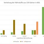 Stickstoff als „Motor des Pflanzenwachstums“ kann nur sehr aufwändig im Boden gemessen werden und sickert mit dem Regen- und Gießwasser leicht in tiefere Bodenschichten. Deshalb ist im Frühjahr eine Stickstoff-Langzeitdüngung in Form von Hornspänen oder Schafwollpelletts sinnvoll. Diese werden langsam abgebaut und geben stetig kleine Mengen Stickstoff an die Pflanzen ab. Beim Blick auf die Verteilung der einzelnen Nährstoffe in den 159 genommenen Proben fällt auf, dass der Anteil von Magnesium in allen Proben hoch oder sehr hoch ist. Dies ist auf das magnesiumhaltige Kalkgestein im Berchtesgadener Land zurückzuführen und beeinträchtigt das Pflanzenwachstum nicht. Allerdings sollte bei mineralischer Düngung auf Dünger mit zusätzlich Magnesium verzichtet werden. Über drei Viertel der Proben weisen einen hohen bis sehr hohen Phosphorgehalt auf. Zwar ist Phosphor wichtig für gesundes Wachstum und maßgeblich für eine gute Entwicklung von Blüten, Früchten und Samen verantwortlich und sollte immer für die Pflanze verfügbar sein, doch ein zu viel des Guten kann auch negative Auswirkungen haben. Zum einen wird auch Phosphor ausgewaschen und beeinträchtigt die Umwelt, speziell Fließgewässer und Seen, negativ. Zum anderen kann es passieren, dass andere Nährstoffe durch das Überangebot an Phosphor von den Pflanzen nicht mehr aufgenommen werden können. Bei der Hälfte der Böden hingegen ist zu wenig Kali enthalten. Kali ist verantwortlich für die Wasserversorgung der Pflanze und beeinflusst dadurch Stabilität, Abwehrkräfte und die Fruchtqualität. Stippige Äpfel und der „Grünkragen“ an Tomaten sind z. B. auf Kalimangel in der Frucht zurückzuführen.