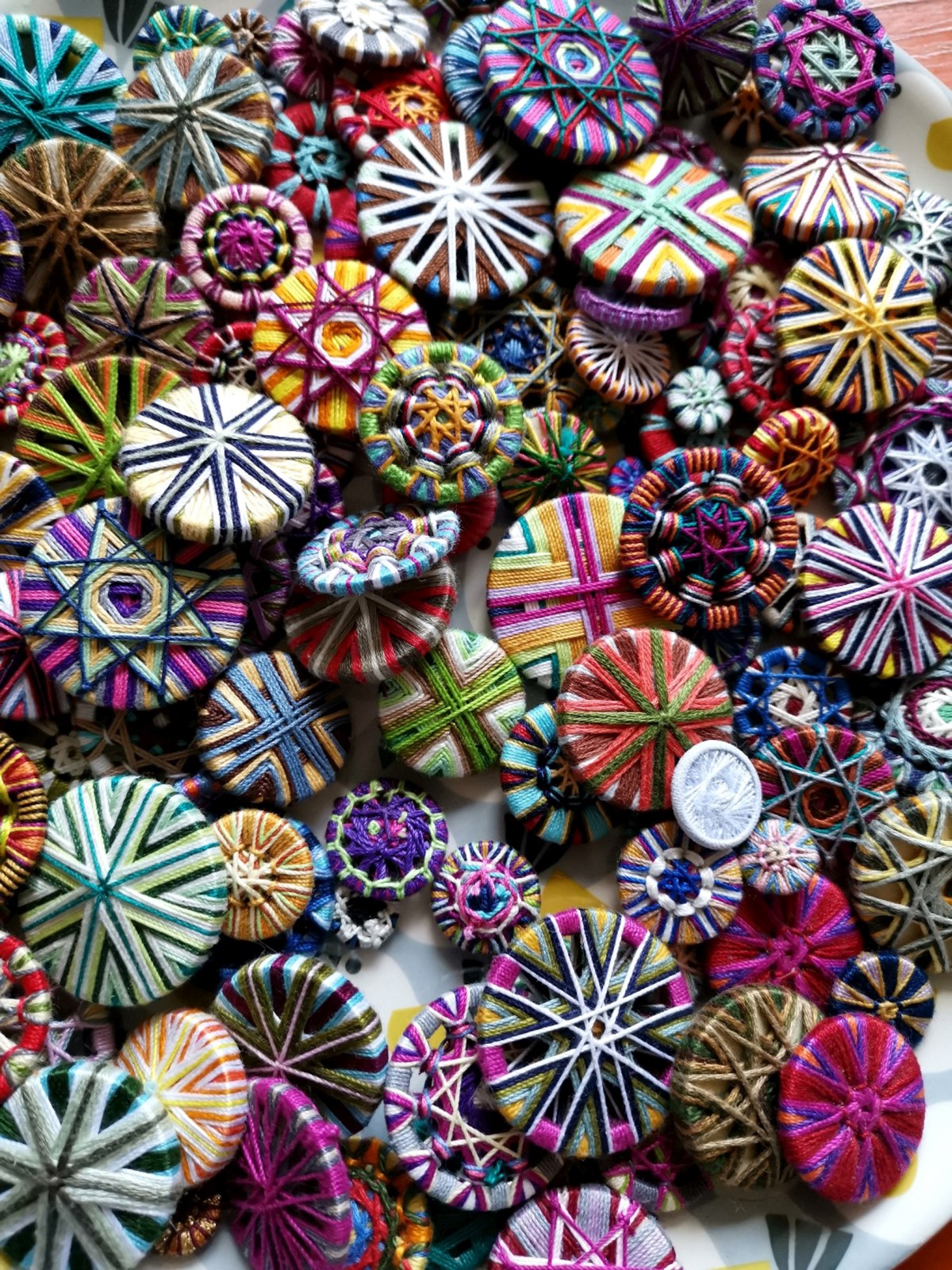 Früher ein schlichter Wäscheknopf – heute farbenfrohe Schmuckstücke: handgewickelte Zwirnknöpfe in allen erdenklichen Tönen und Mustern. © Bezirk Oberbayern, Archiv Bauernhausmuseum Amerang, Aufnahme: Rosi Raab.